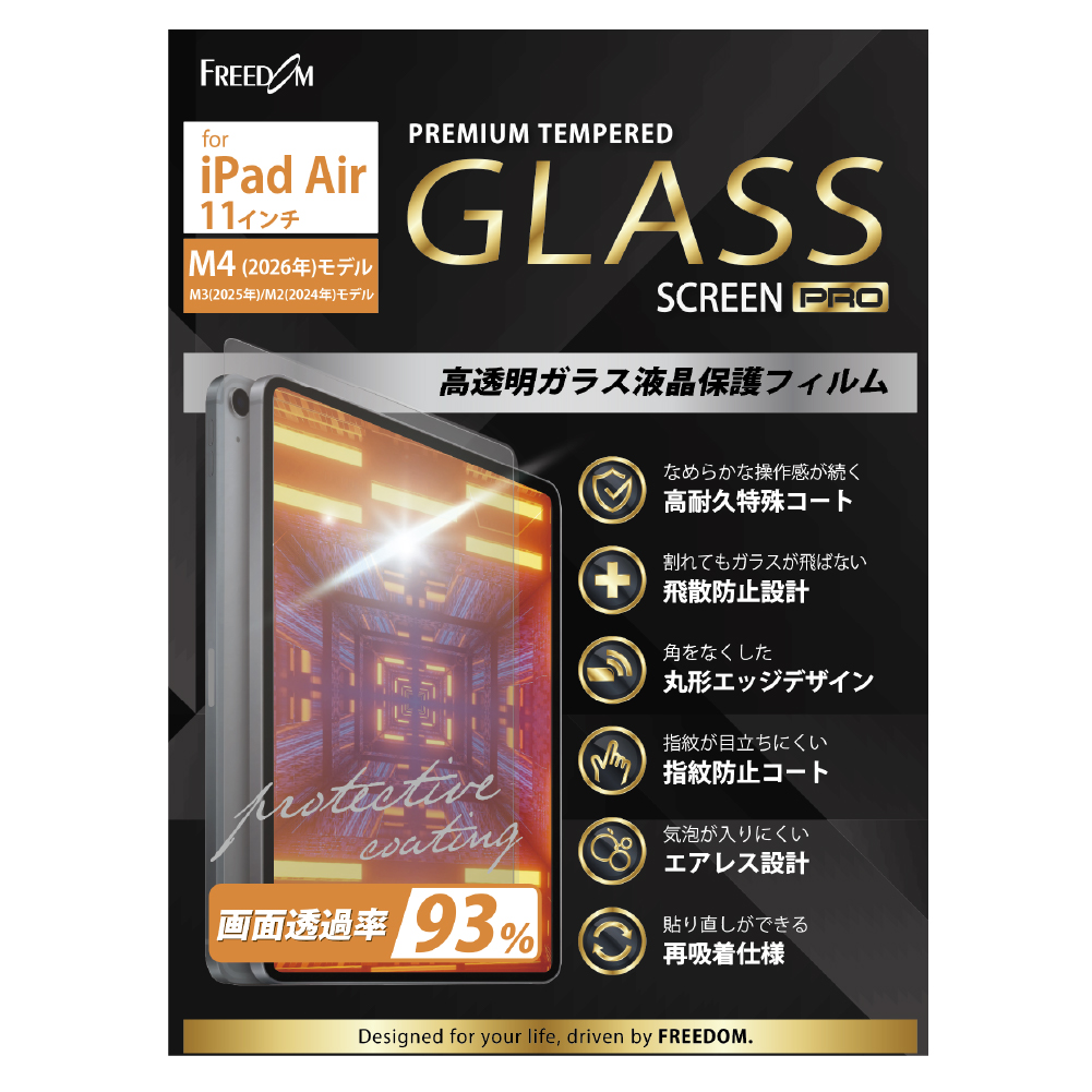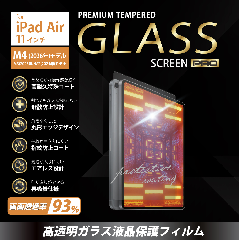 透過率93%、滑らかな操作感が続く高耐久特殊コート、11インチiPad Air(M4/M3/M2モデル)高透明ガラス液晶保護フィルム