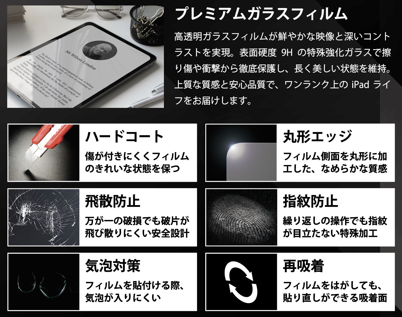 11インチ iPad Air(M4/M3/M2モデル)高透明ガラス液晶保護フィルム