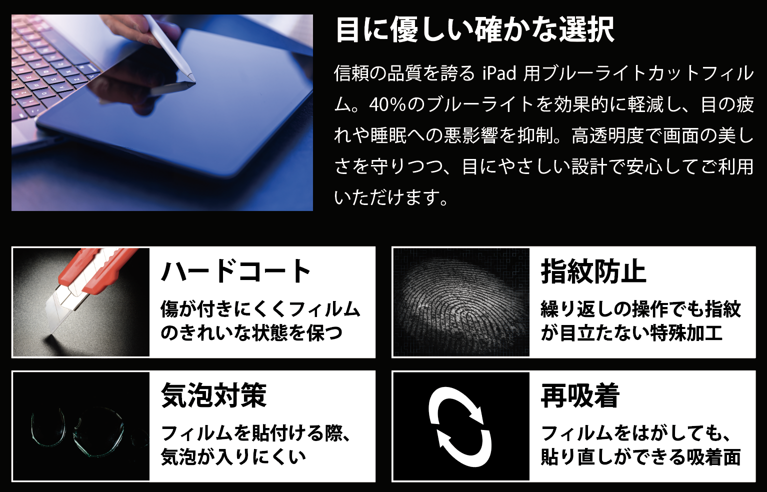 40%のブルーライトを効果的に軽減し、目の疲れや睡眠への悪影響を抑制。高透明度で画面の美しさをまもりつつ、目に優しい設計で安心して使えます。