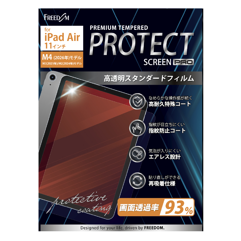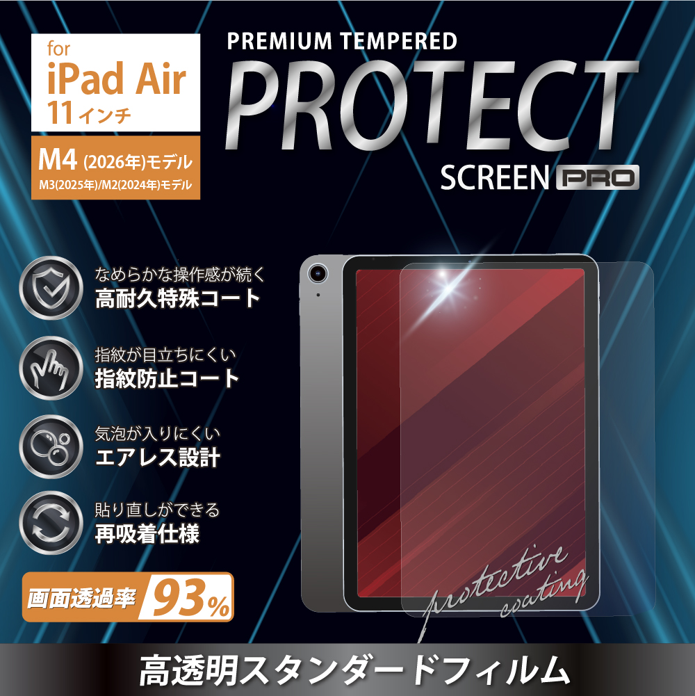 画面透過率率93%、滑らかな操作感が続く高耐久特殊コート、11インチiPad Air(M4/M3/M2モデル)高透明スタンダードPETフィルム