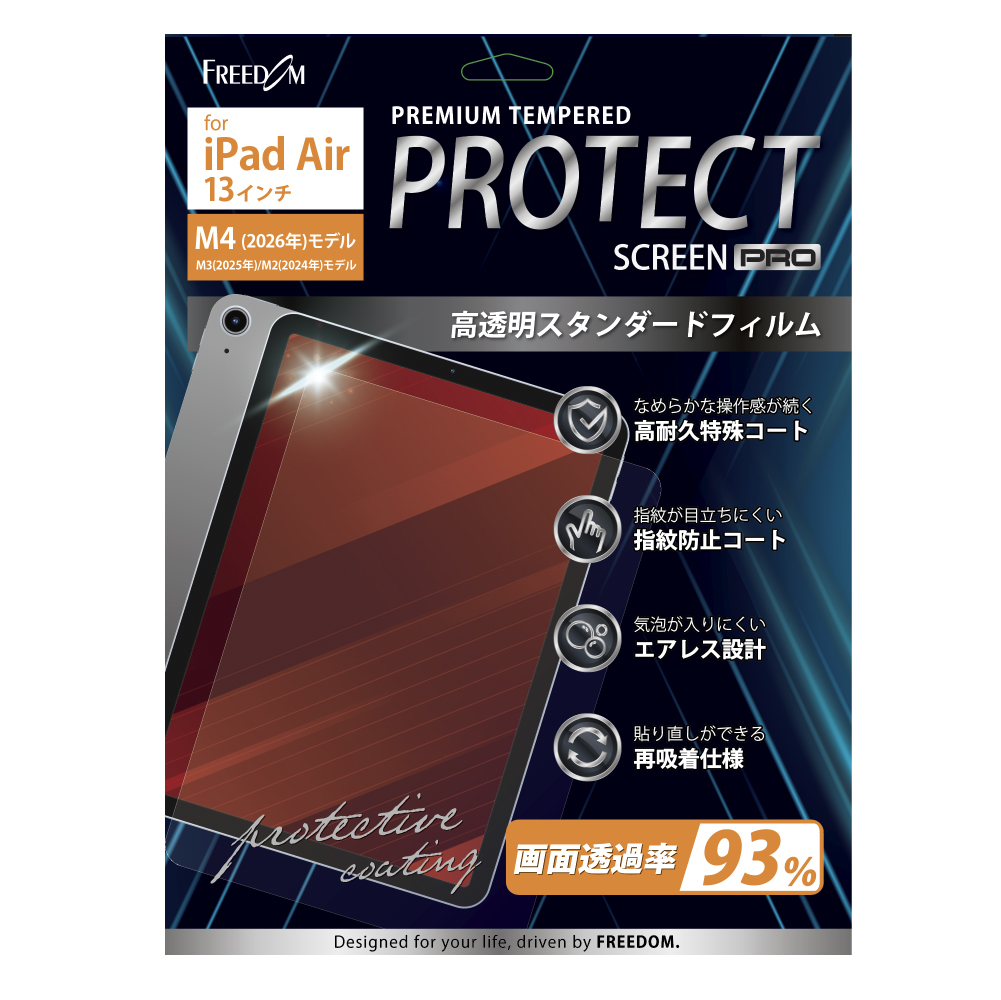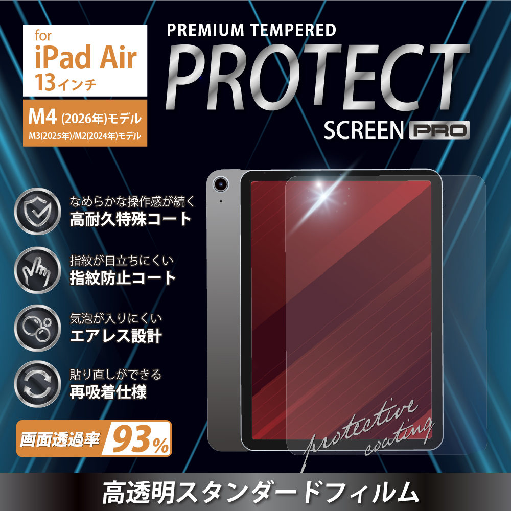 透過率93%、滑らかな操作感が続く高耐久特殊コート、13インチiPad Air(M4/M3/M2モデル)高透明スタンダードPETフィルム