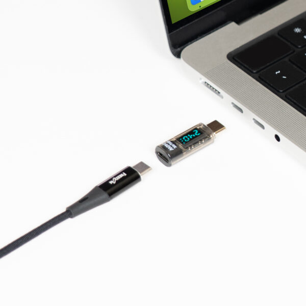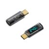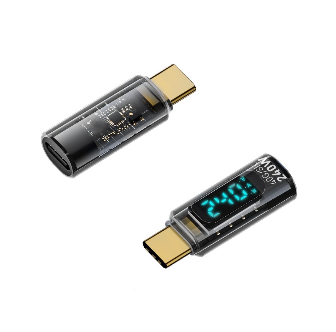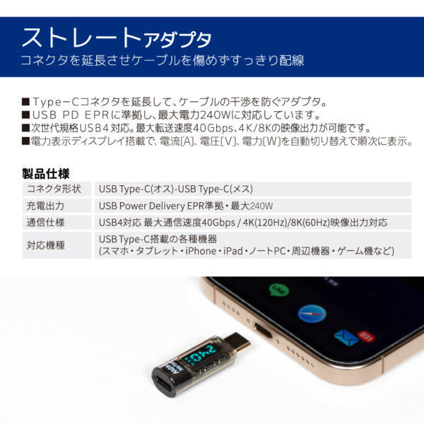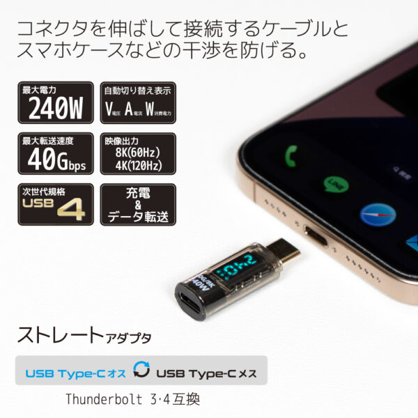 一目で分かる電力表示ディスプレイを搭載したUSB4対応Type-C変換アダプタ、電流[A]、電圧[V]、電力[W]を自動切り替えで順次に表示。高速充電(USB PD240W)、高速データ転送(最大40Gbps)、映像出力(8K/60Hz)に対応したストレート型アダプタ。