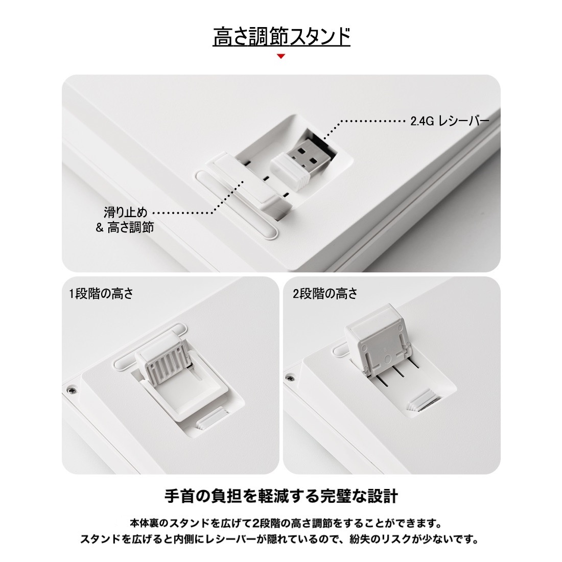 | 付属品 | USB Type-C ケーブル(1.5m)、2.4GHz 無線用USBドングル、キースイッチプラー( 一体型)、交換用キーキャップ(ESC・ENTER)、予備スイッチ 1個、説明書 |