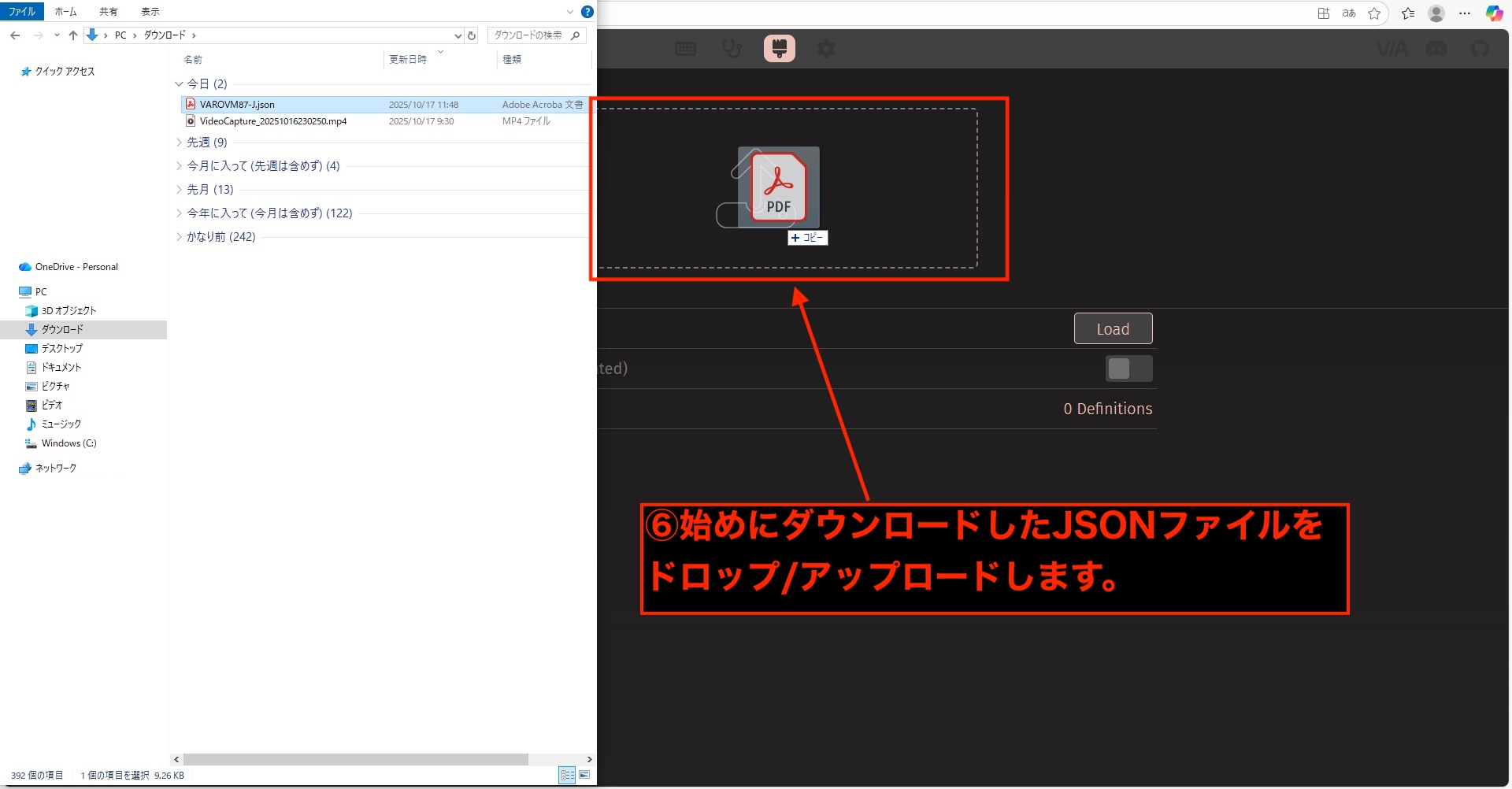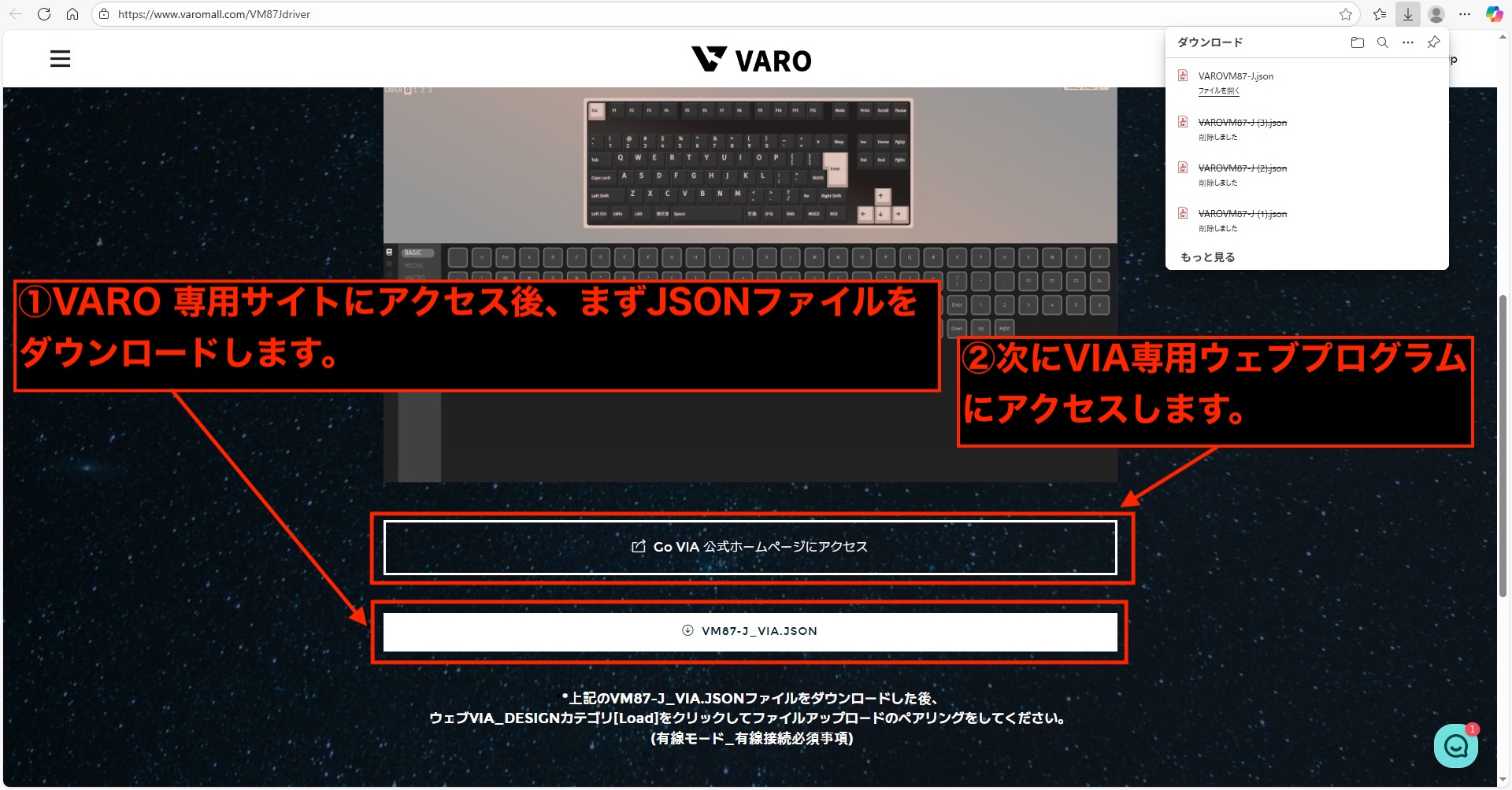 VARO専用サイトにアクセス後、まずJSONファイルをダウンロードします。 手順 ➀キーボード本体とパソコンを有線接続してください。 ②VIA専用ウェブプログラムにアクセスします。(設定手順1)