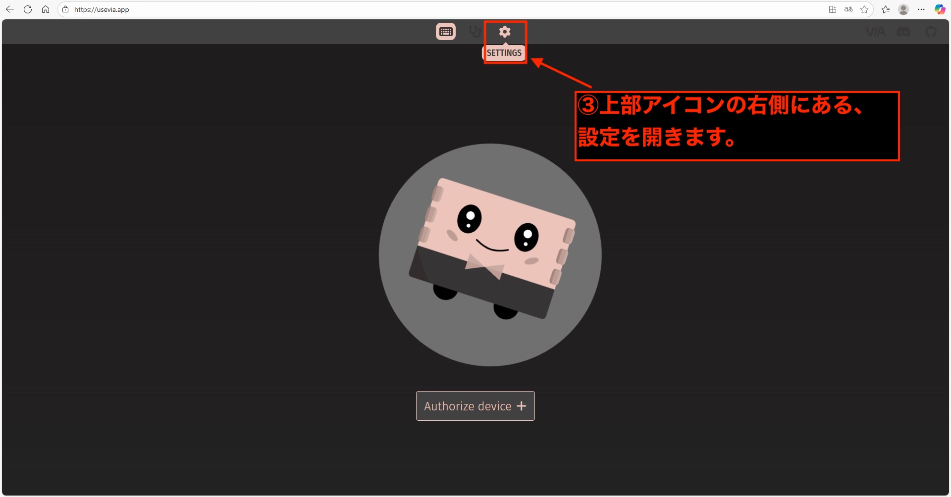 ③上部アイコンの右側にある、「SETTINGS(設定)」を開きます。(設定手順2)