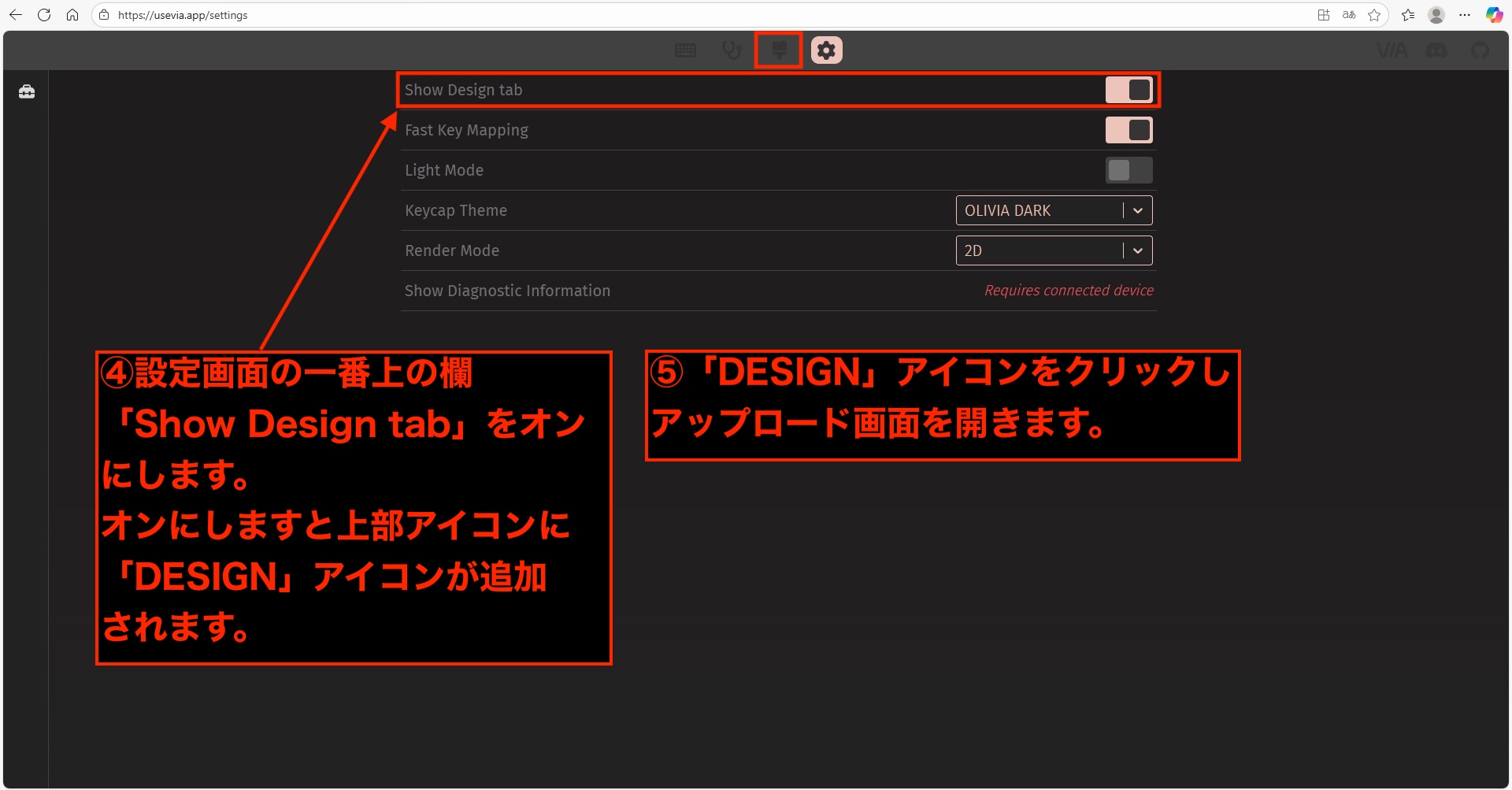 ④設定画面の一番上「Show Design tab」をオンにします。オンにしますと上部アイコンに「DESIGN」アイコンが追加されます。(設定手順3)