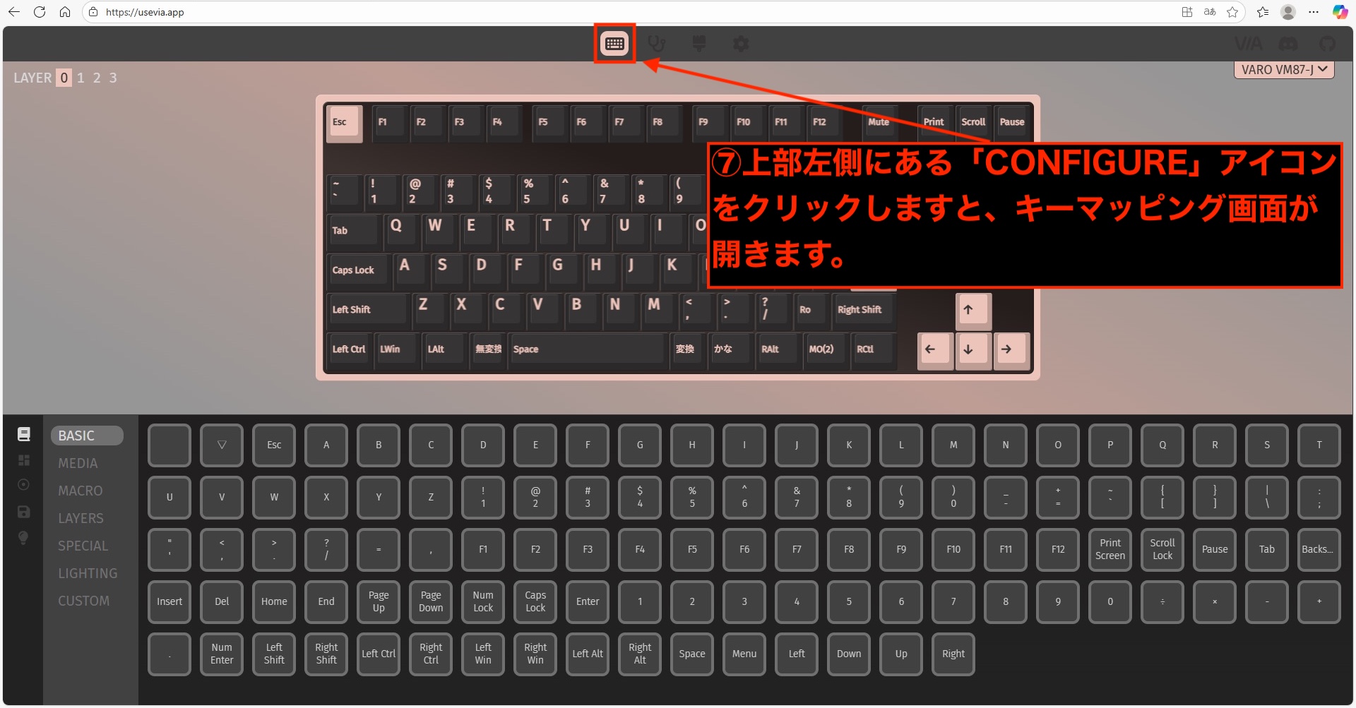 ⑦上部アイコンの左側にある「CONFIGURE」を開きますと、キー設定画面が開き、キー設定ができます。(設定手順5)